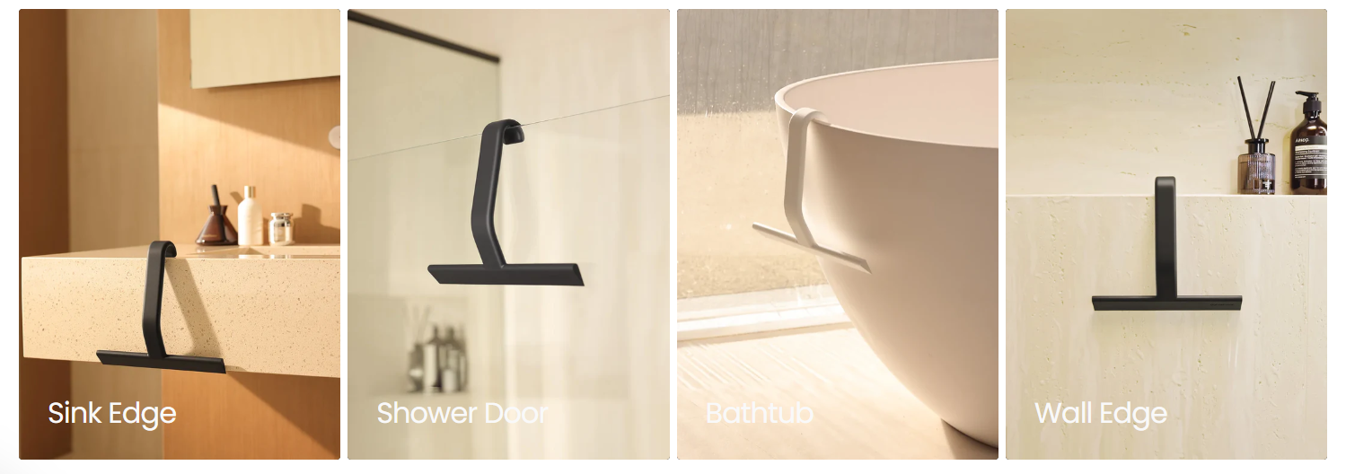 Unlike standard squeegees that rely on suction cups or adhesive holders, the JustHang Squeegee has a molded integrated hook that lets you hang it almost anywhere. This simple feature is what makes it stand out.